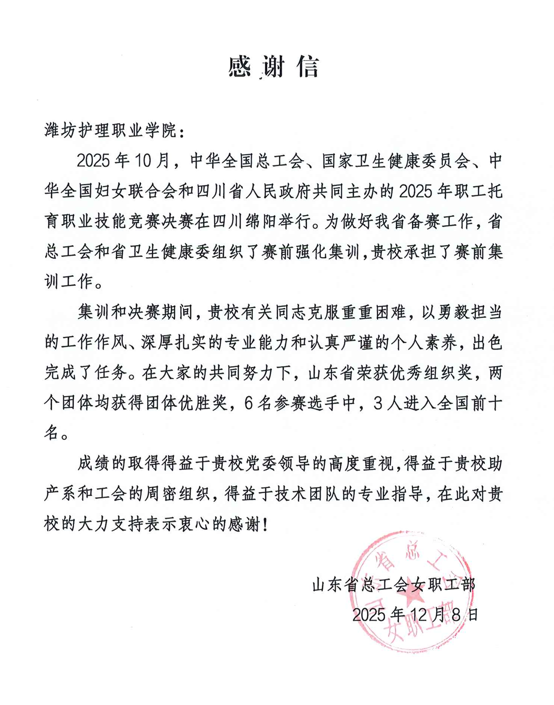 鉴于助产系指导团队的重要贡献和学院工会的周密组织,山东省总工会特向我校致发感谢信,对我校教师的专业能力、奉献精神及扎实成效给予高度赞扬。