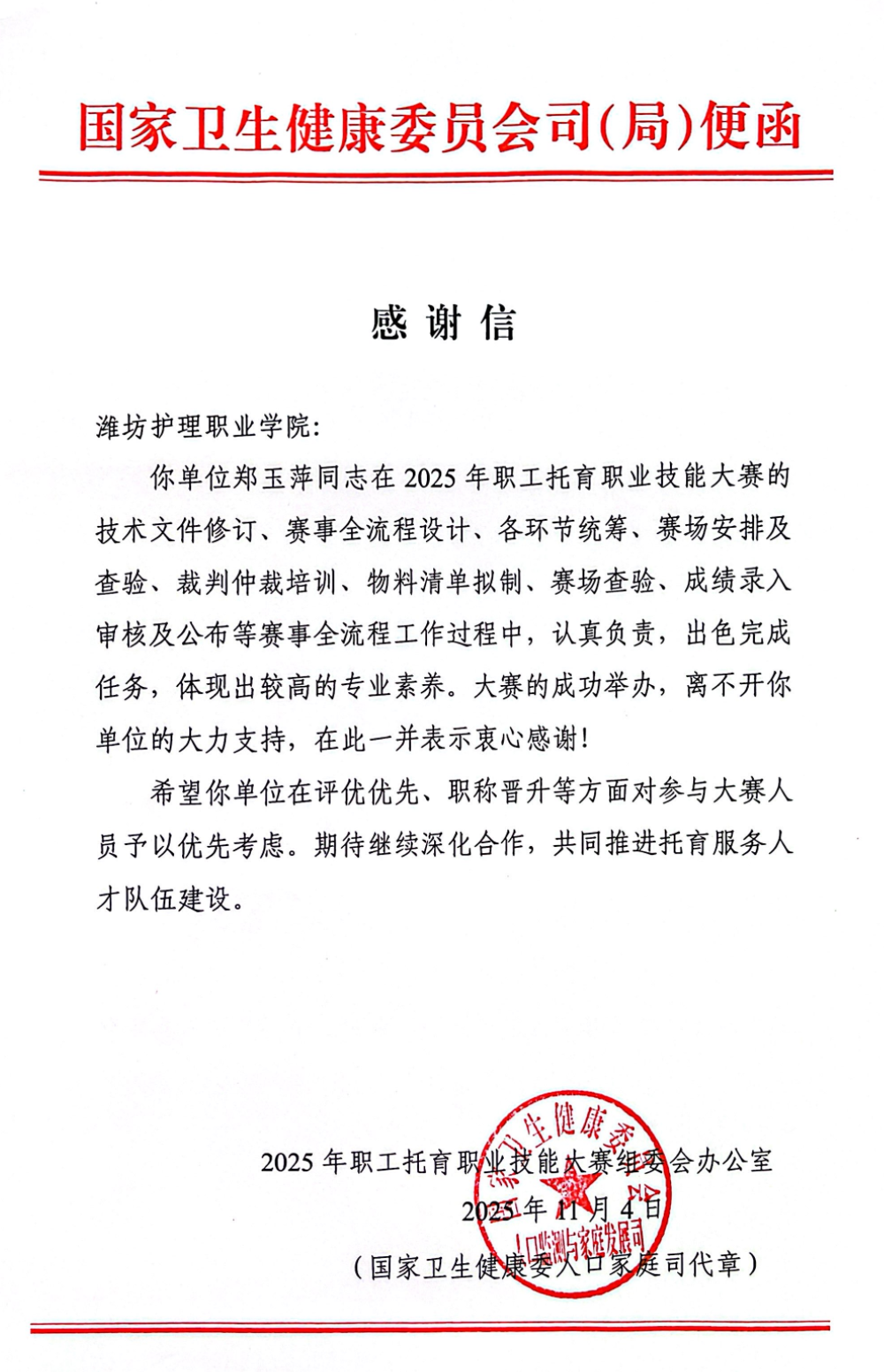 近日,国家卫生健康委员会人口家庭司向我院发来感谢信,对郑玉萍同志在2025年全国职工托育职业技能大赛中担任总裁判长期间的卓越贡献表示高度肯定。这既是对郑玉萍主任个人专业能力的认可,也是对我院婴幼儿托育服务与管理专业建设成果的充分褒奖。