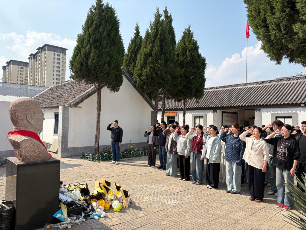 松柏凝翠,英烈千秋。师生们怀着崇敬之心列队于庄龙甲烈士雕像前,全体党员面向党旗高举右拳,重温入党誓词。铿锵有力的誓言回荡广场,进一步坚定了大家的理想信念与责任担当。随后,师生们走进故居展厅,聆听革命事迹,观看历史照片、文献资料与实物展品,沉浸式感悟革命先辈为民族解放事业奋勇拼搏的崇高精神,在回望历史中接受了深刻的党性教育和精神洗礼,筑牢了信仰之基。
