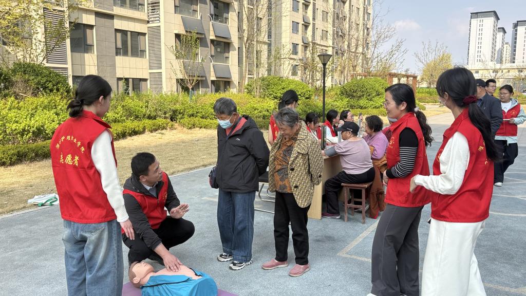 红色教育润初心,志愿服务践使命。主题党日活动结束后,师生志愿者们前往上城虞园小区开展健康义诊。现场志愿者分工有序、热情服务,为社区居民免费测量血压,耐心解答高血压防治、日常保健等问题,细致讲解健康生活方式与疾病预防知识。专业教师还带领学生开展急救技能教学,手把手向居民传授心肺复苏、海姆立克急救法等实操技巧,切实提升群众的自救互救能力,让社区居民在家门口收获专业的健康关怀。